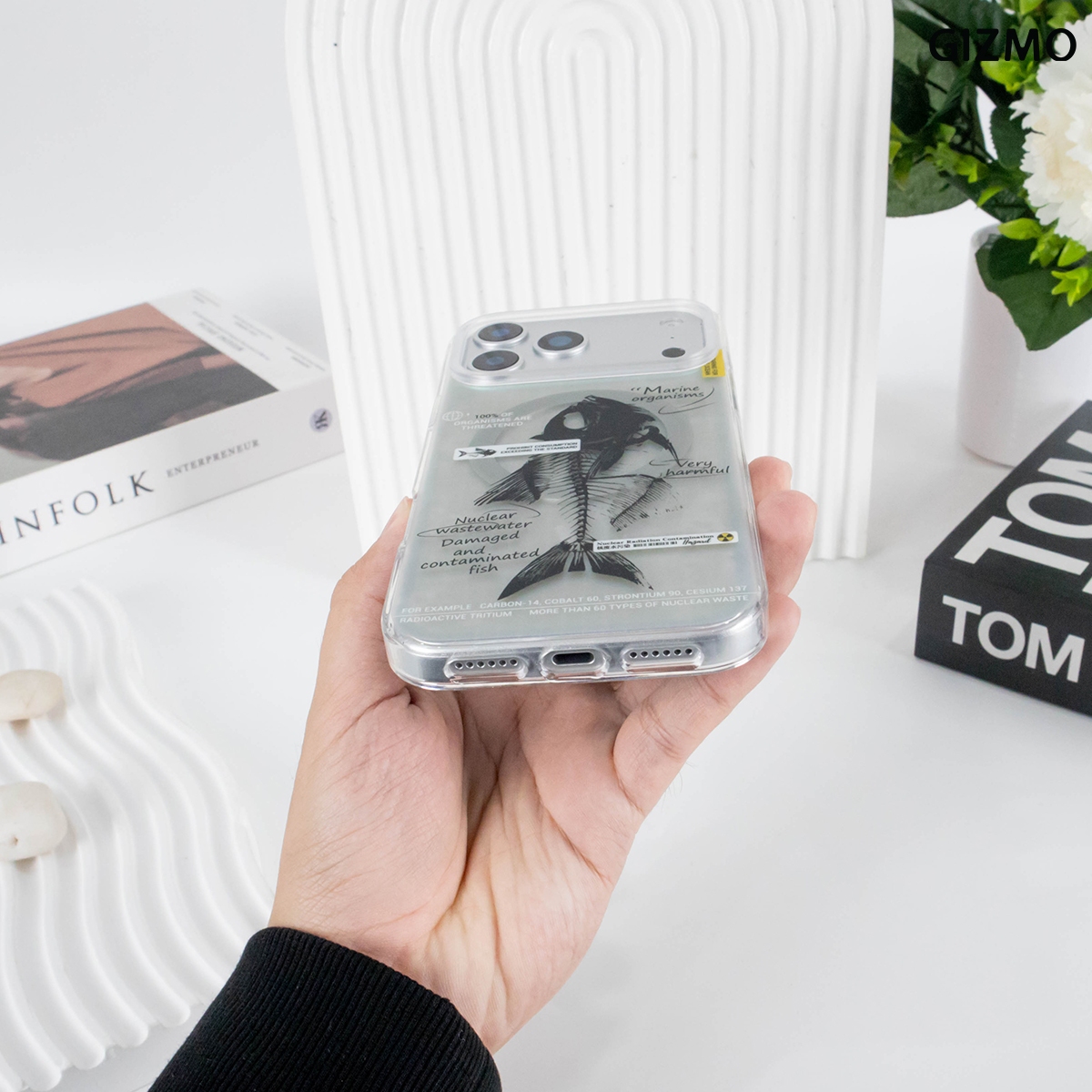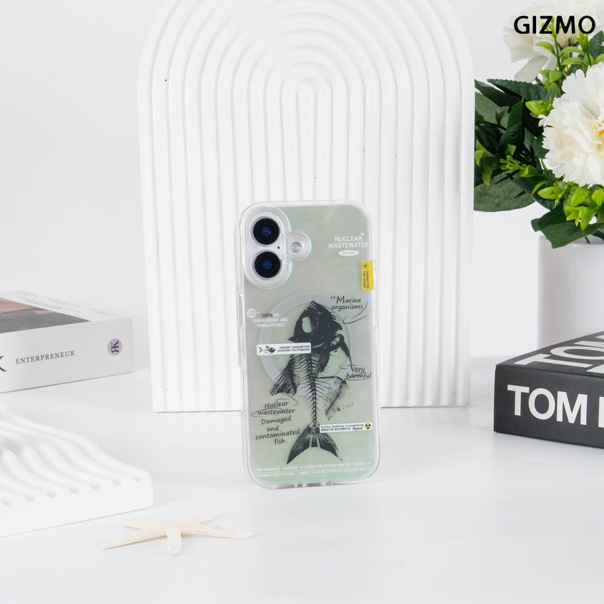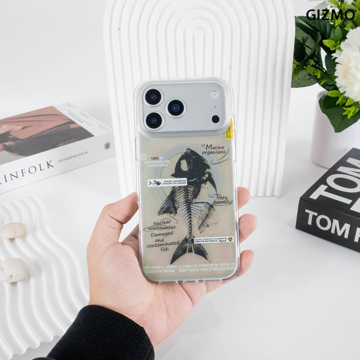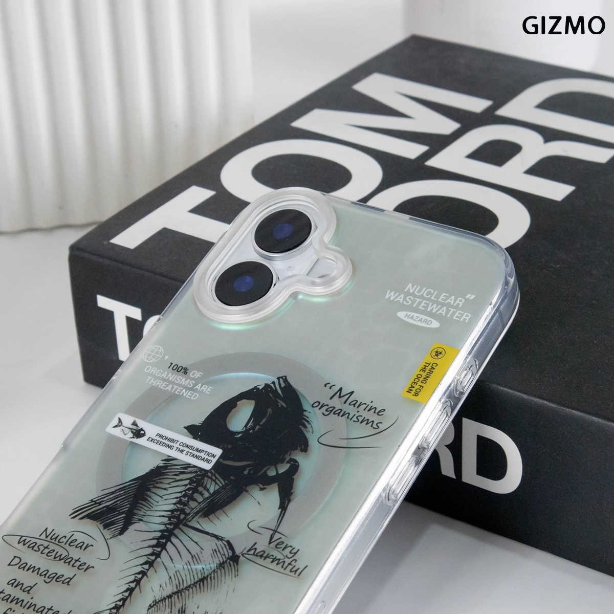 เคส iPhone 17 ดีไซน์ล้ำสมัยจาก GIZMO มาพร้อมเอฟเฟกต์โฮโลแกรมเล่นแสงสีรุ้ง โดดเด่นด้วยลายก้างปลา (Fishbone) และข้อความเสียดสีสังคม Nuclear Wastewater แข็งแรงทนทาน และรองรับการชาร์จ MagSafe ได้เต็มรูปแบบ