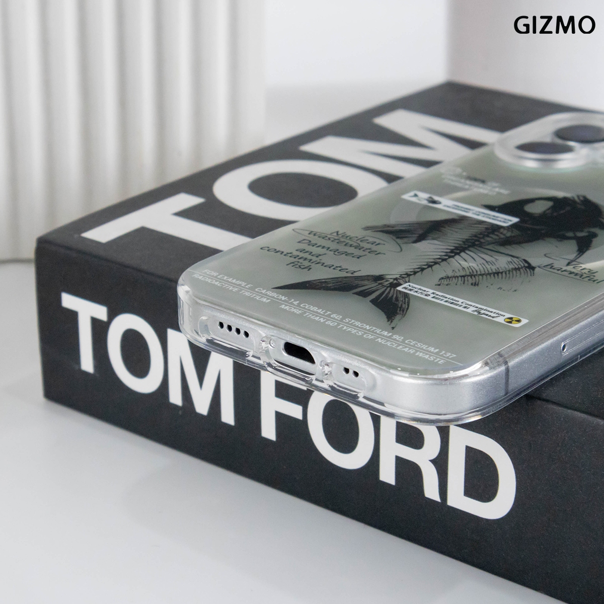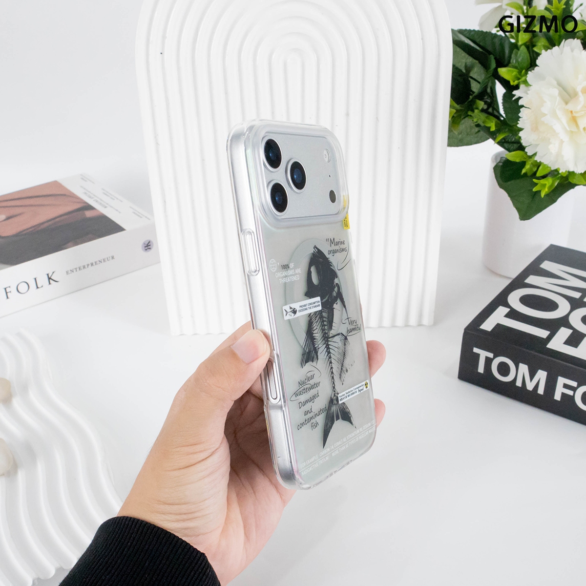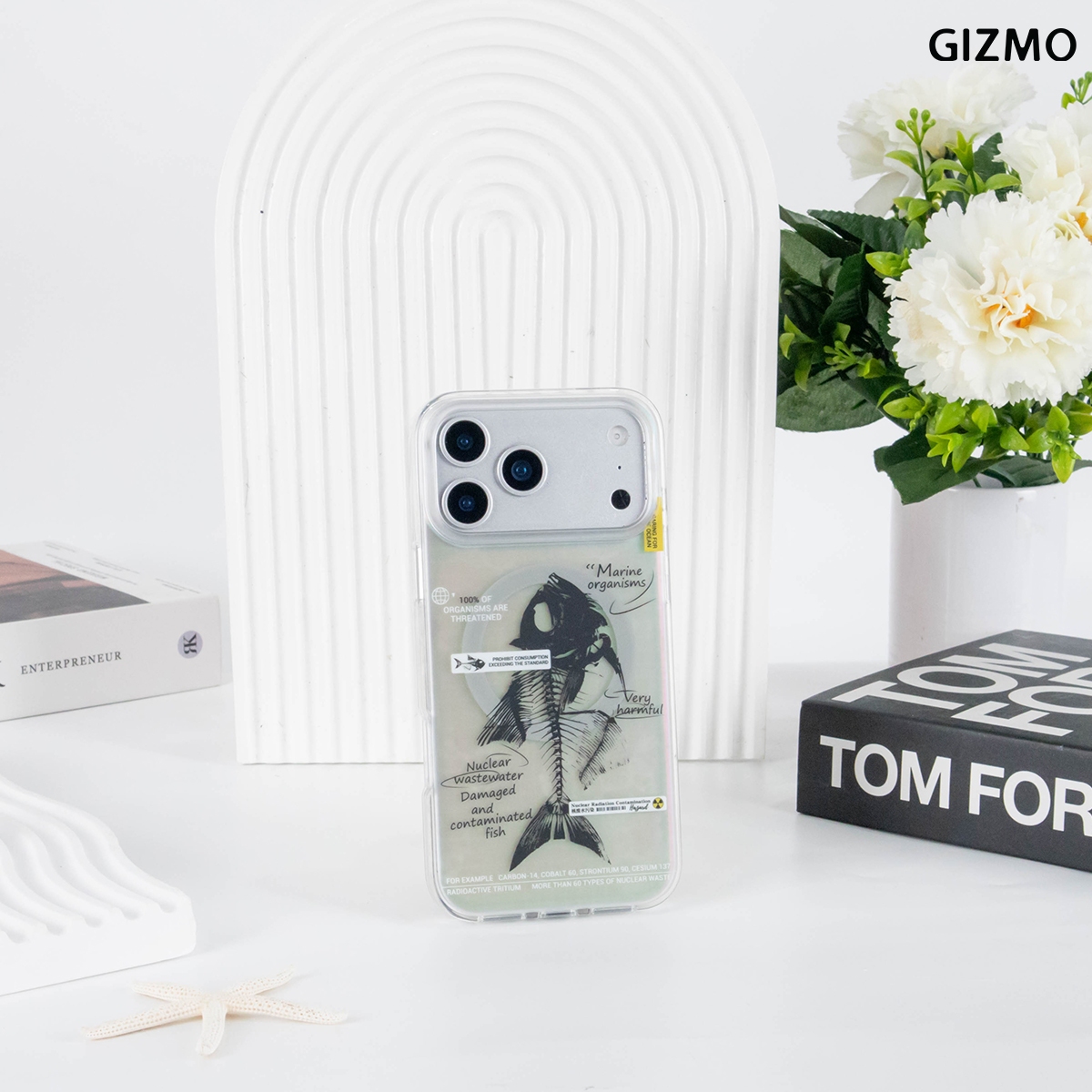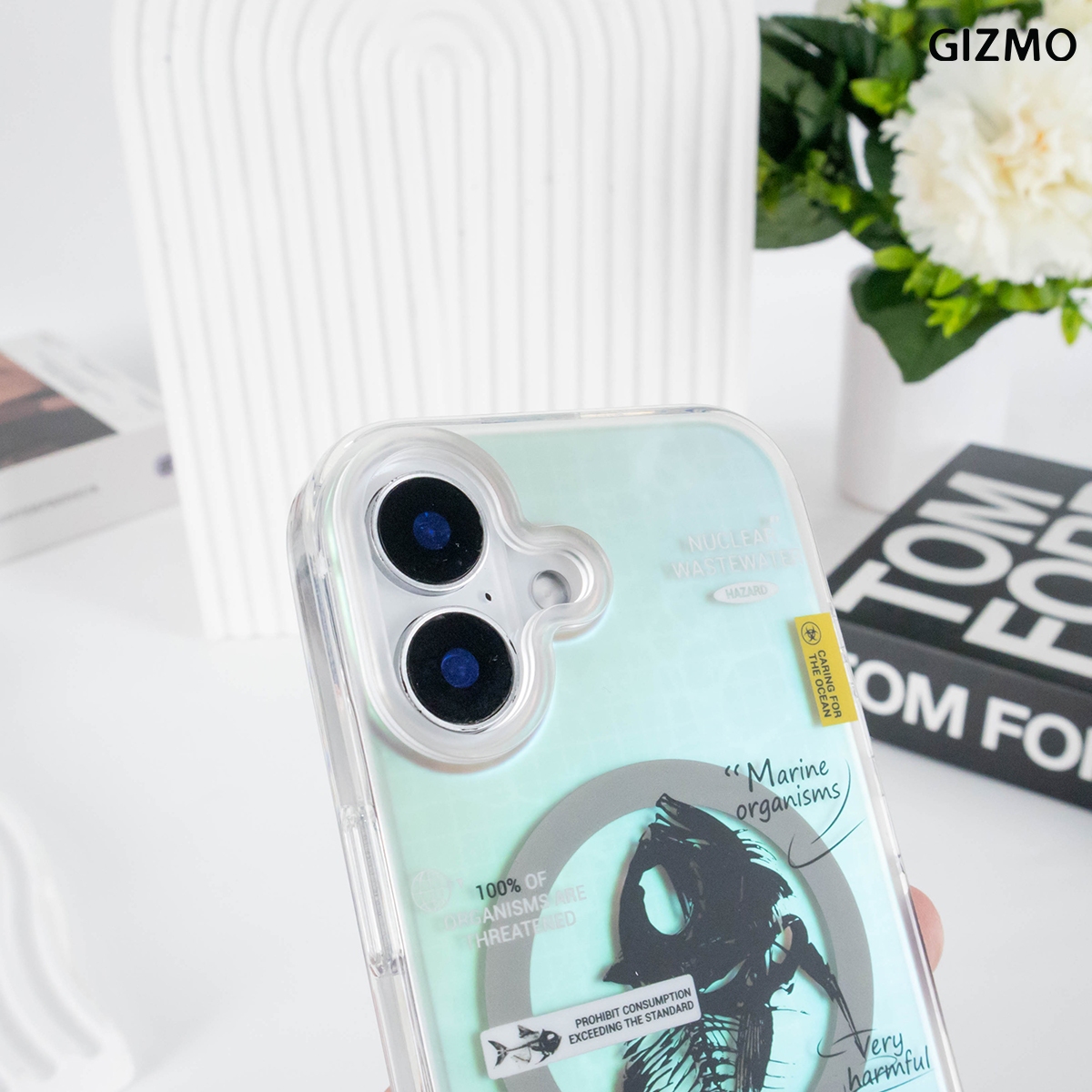 เคส iPhone 17 ดีไซน์ล้ำสมัยจาก GIZMO มาพร้อมเอฟเฟกต์โฮโลแกรมเล่นแสงสีรุ้ง โดดเด่นด้วยลายก้างปลา (Fishbone) และข้อความเสียดสีสังคม Nuclear Wastewater แข็งแรงทนทาน และรองรับการชาร์จ MagSafe ได้เต็มรูปแบบ
