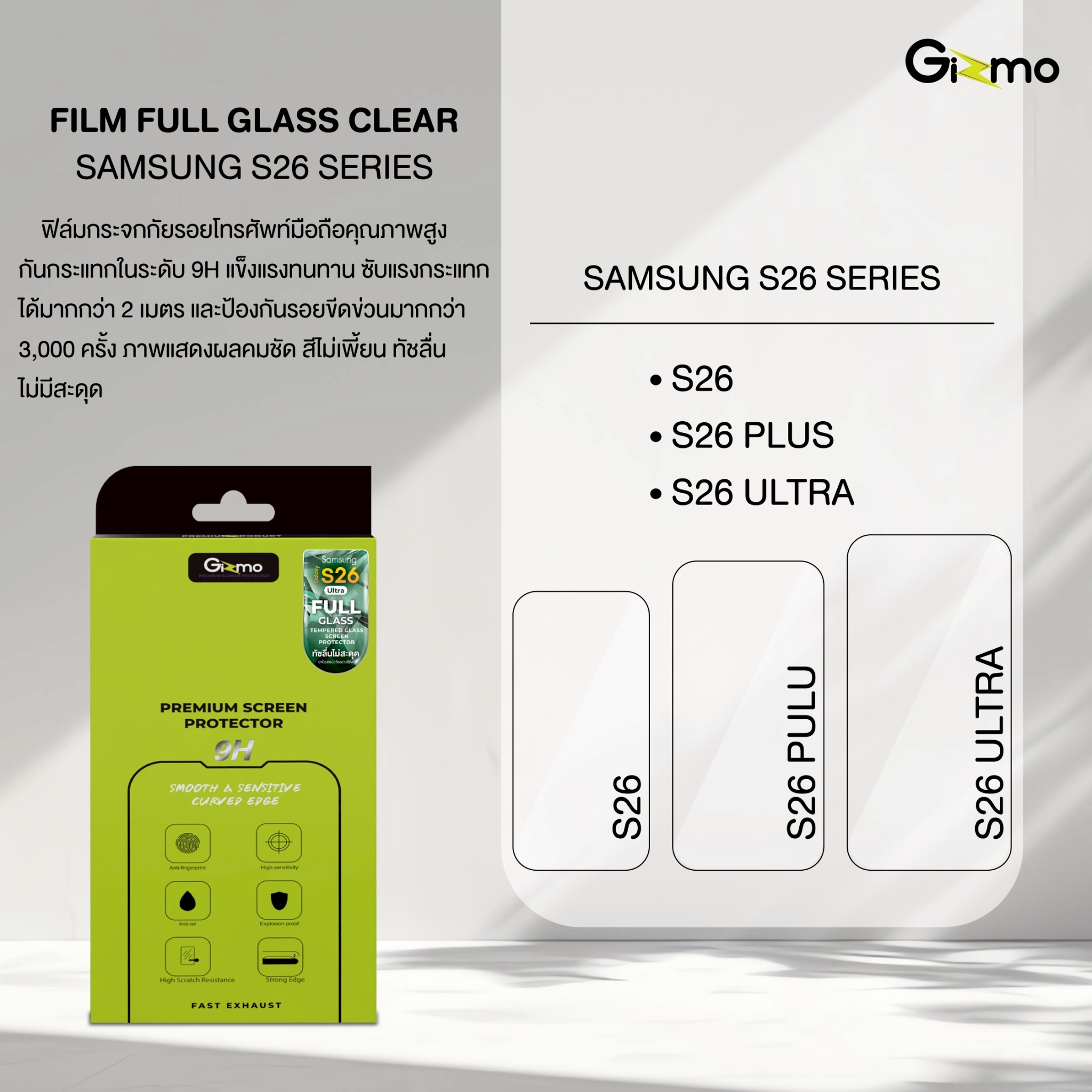 ปกป้องหน้าจอ Samsung S26 Series ของคุณด้วย Gizmo Film ฟิล์มกระจกนิรภัย 2 ชั้น แข็งแกร่งระดับ 9H กันกระแทกสูงสุด 2 เมตร สัมผัสลื่น ภาพคมชัดระดับ HD พร้อมแถมฟรีฟิล์มหลังในชุด