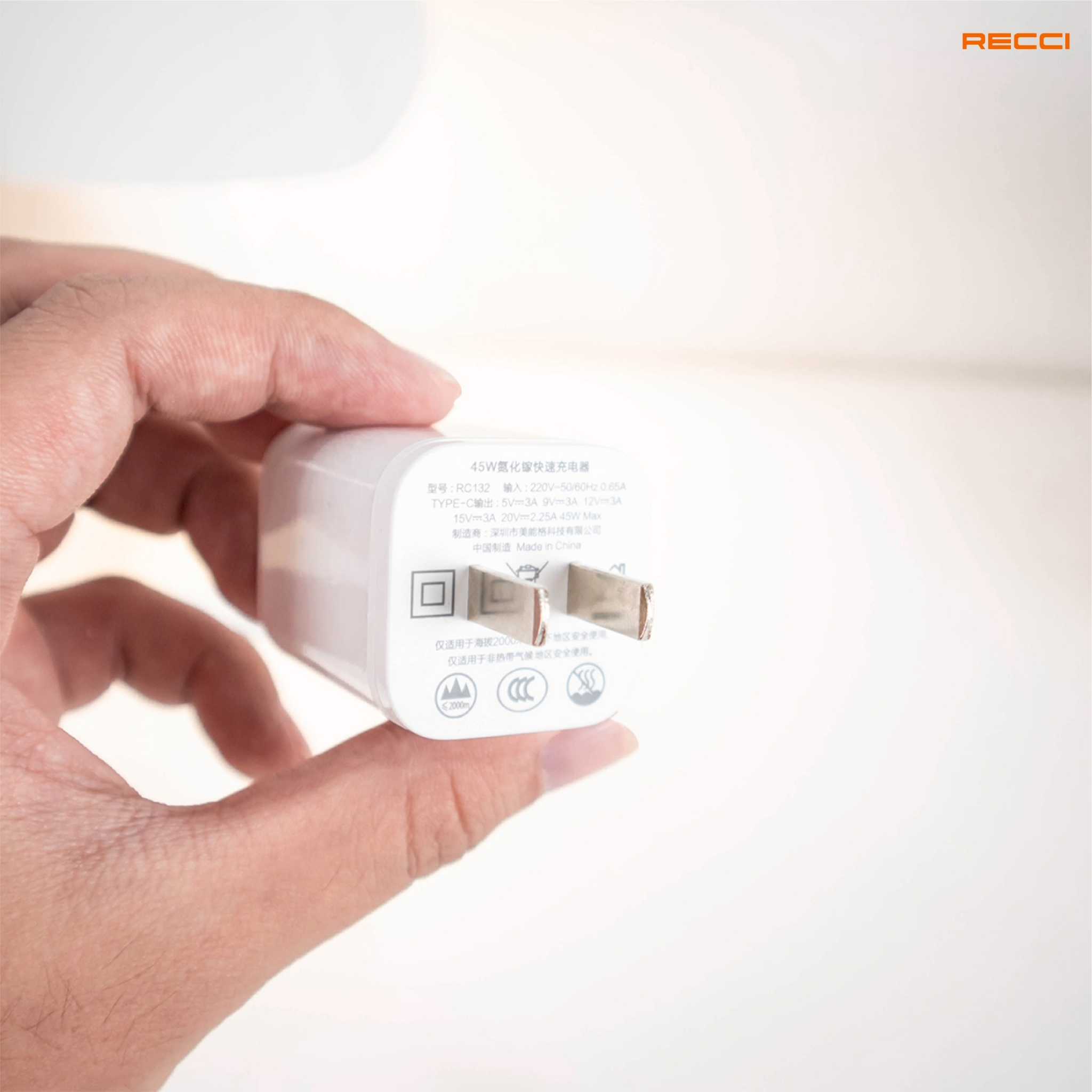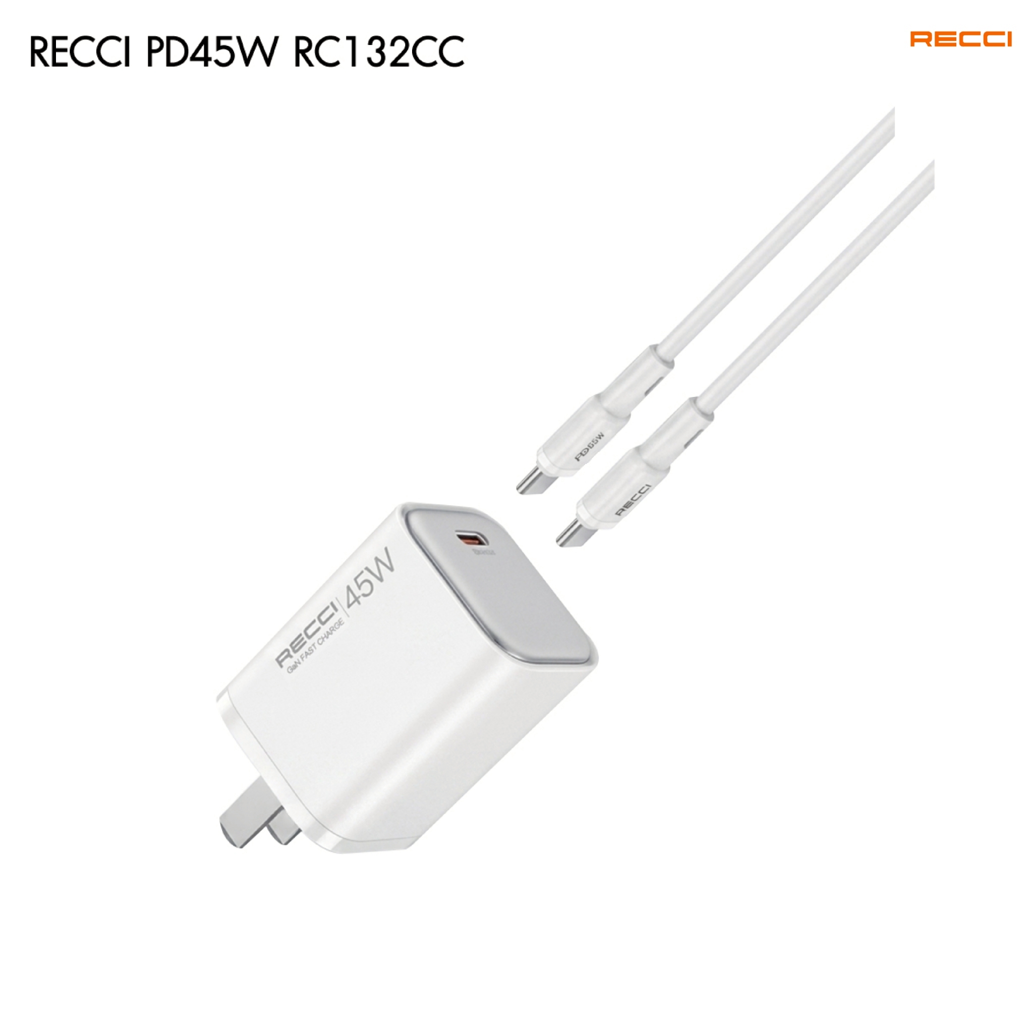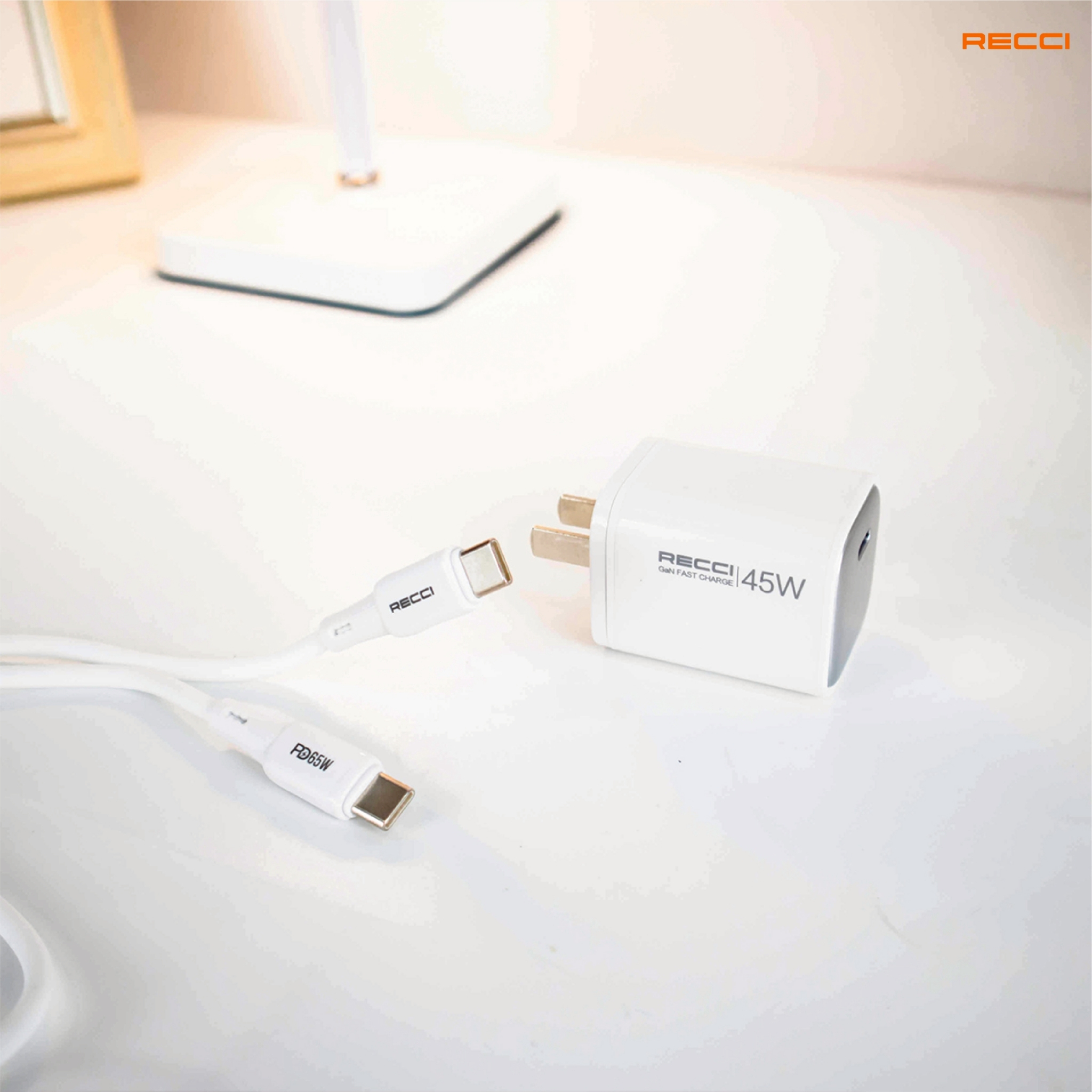 ชุดชาร์จเร็ว Recci 45W เทคโนโลยี GaN ประสิทธิภาพสูง ขนาดกะทัดรัด จ่ายไฟแรงเสถียร รองรับ PD Fast Charge สำหรับ iPhone, Samsung และ Laptop มาพร้อมสายชาร์จคุณภาพสูงครบชุดในราคาสุดคุ้ม