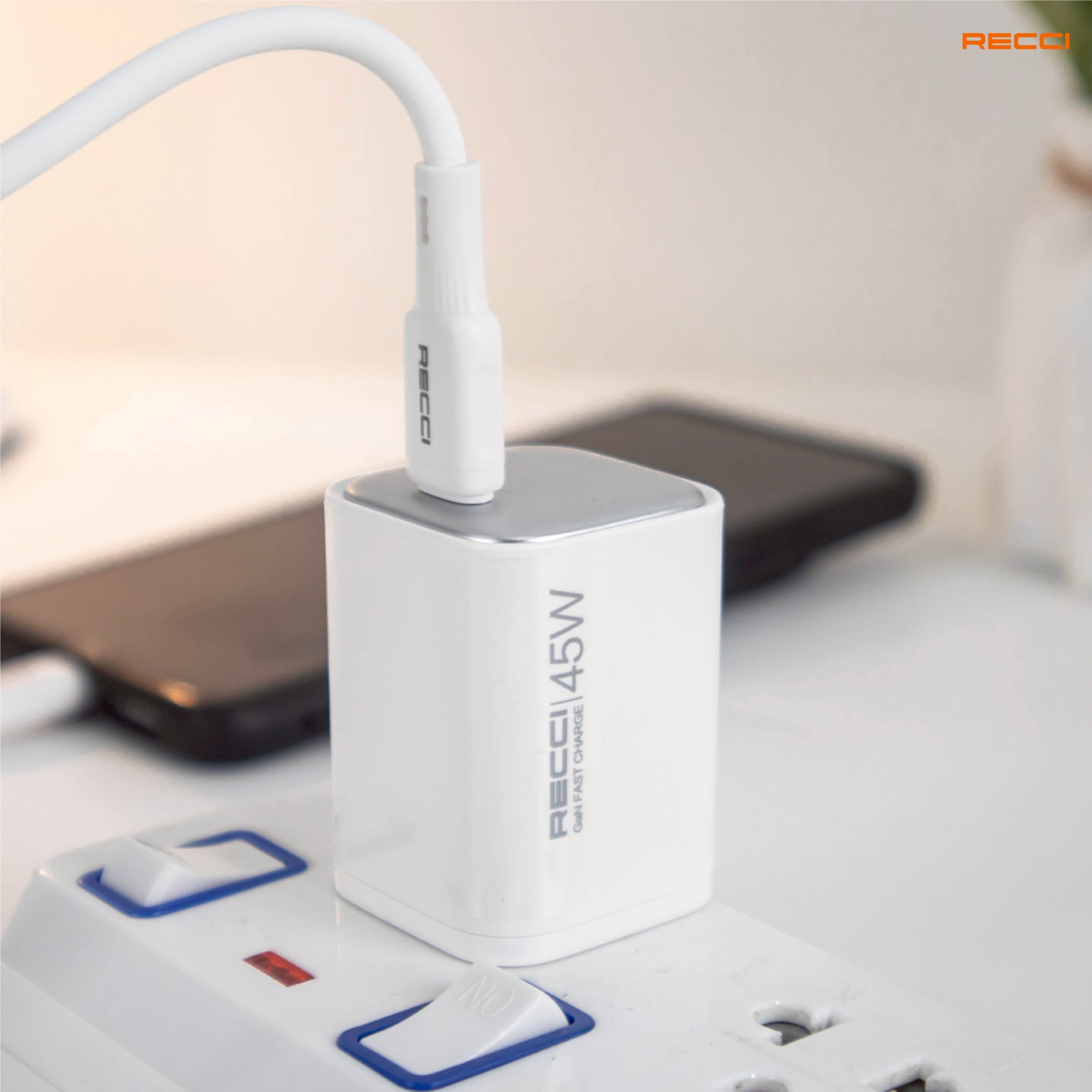 หัวชาร์จเร็ว Recci 45W รุ่น RC132 มาพร้อมเทคโนโลยี GaN ที่ทำให้ขนาดเล็กพกพาง่ายแต่จ่ายไฟแรงเต็มสปีด รองรับระบบ PD Fast Charge สำหรับ iPhone, iPad, Samsung และ MacBook Air ดีไซน์พรีเมียม ปลอดภัยด้วยระบบควบคุมความร้อนอัจฉริยะ